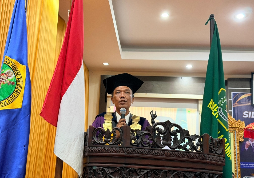 Prof. Nengah Duija, Direktur Jenderal Bimbingan Masyarakat Hindu Kementerian Agama Republik Indonesia, menegaskan pentingnya peran aktif dosen dan guru besar untuk turun langsung ke masyarakat serta memperkenalkan diri sebagai bagian dari pengabdian dan kontribusi nyata bagi umat Hindu. Hal tersebut disampaikan dalam Sidang Senat Terbuka dalam rangka Dies Natalis ke XXV dan Wisuda Sarjana ke XXV serta Wisuda Pascasarjana ke-XII IAHN Gde Pudja Mataram, Sabtu (21/2/2026), di Aula Lantai 3 Rektorat IAHN Gde Pudja Mataram.