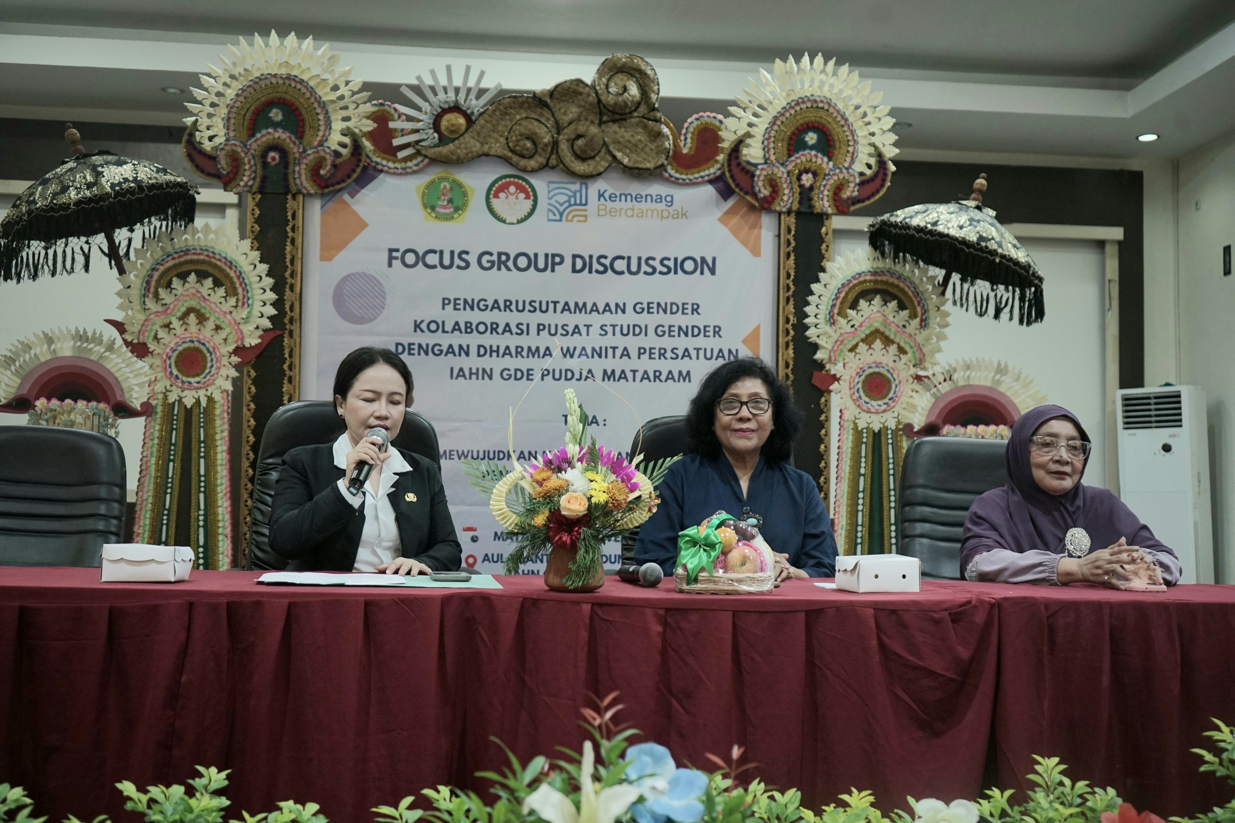 Ketua DWP IAHN Gde Pudja Mataram, Ir. Ni Wayan Ersani Wirata, menyampaikan apresiasi dan dukungan penuh atas terselenggaranya kegiatan ini. FGD menghadirkan narasumber utama Prof. Dr. Ir. Ruth Stella Petrunella Thei, MS., dari Universitas Mataram, bersama Dr. Dra. Hj. Sri Wahyulina, M.Hum., yang memperkaya wawasan peserta mengenai isu-isu gender kontemporer. Moderator dipandu oleh Sekretaris DWP IAHN Gde Pudja Mataram. Ny. Ni Made Ayu Gempa Wati, S.Ag.,M.Pd.H