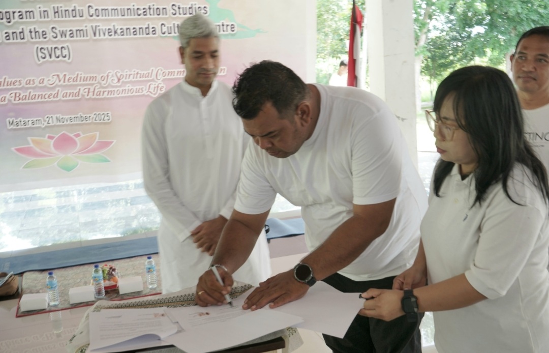 Mataram, 21 November 2025 – Fakultas Dharma Duta, Brahma Widya, dan Dharma Sastra Institut Agama Hindu Negeri (IAHN) Gde Pudja Mataram menjalin kerja sama strategis internasional dengan Swami Vivekananda Cultural Centre (SVCC) Bali. Kemitraan ini diresmikan melalui penandatanganan Nota Kesepahaman Bersama (MoA) yang berfokus pada implementasi Tri Dharma Perguruan Tinggi, meliputi bidang pendidikan, publikasi ilmiah, dan pengabdian kepada masyarakat.
