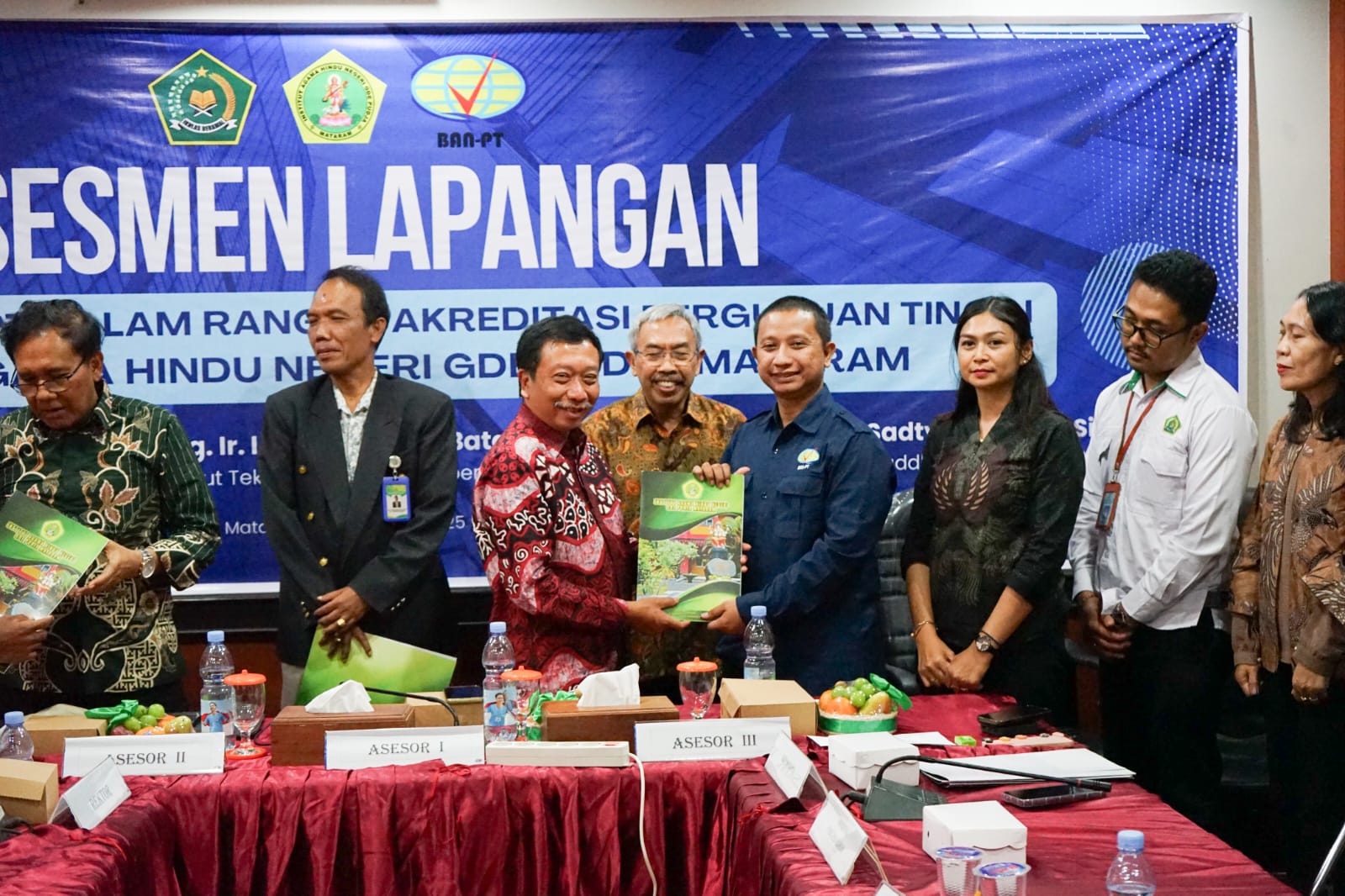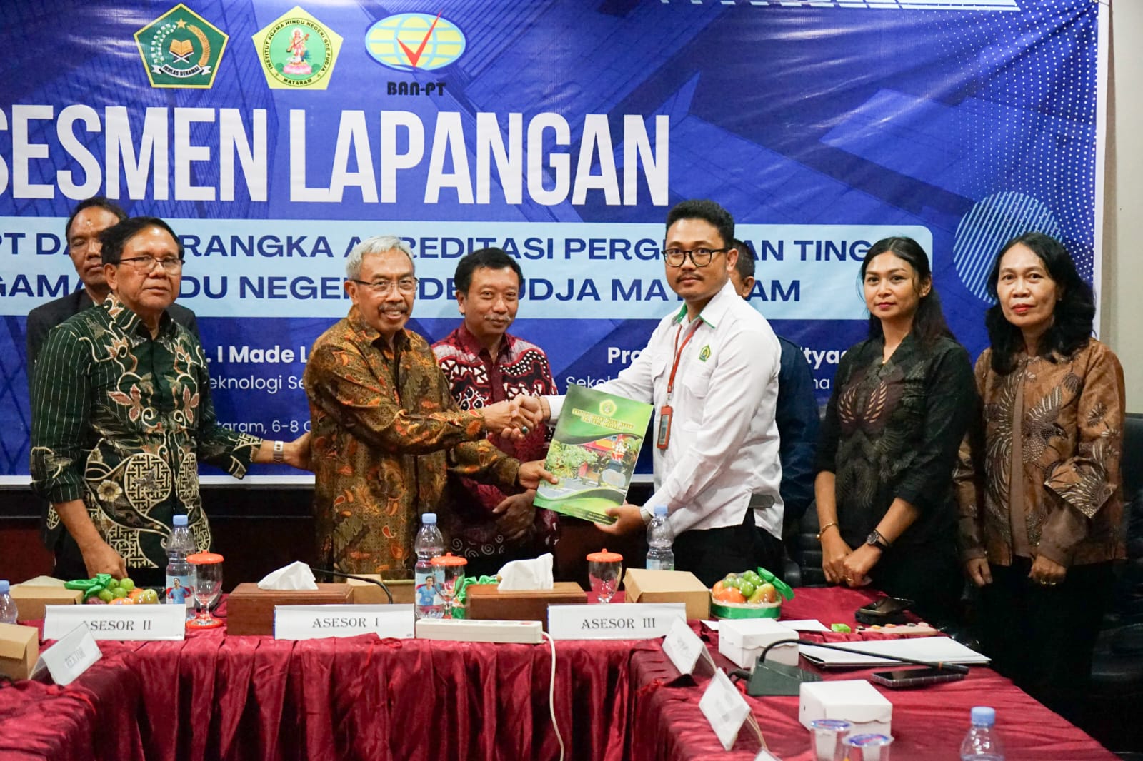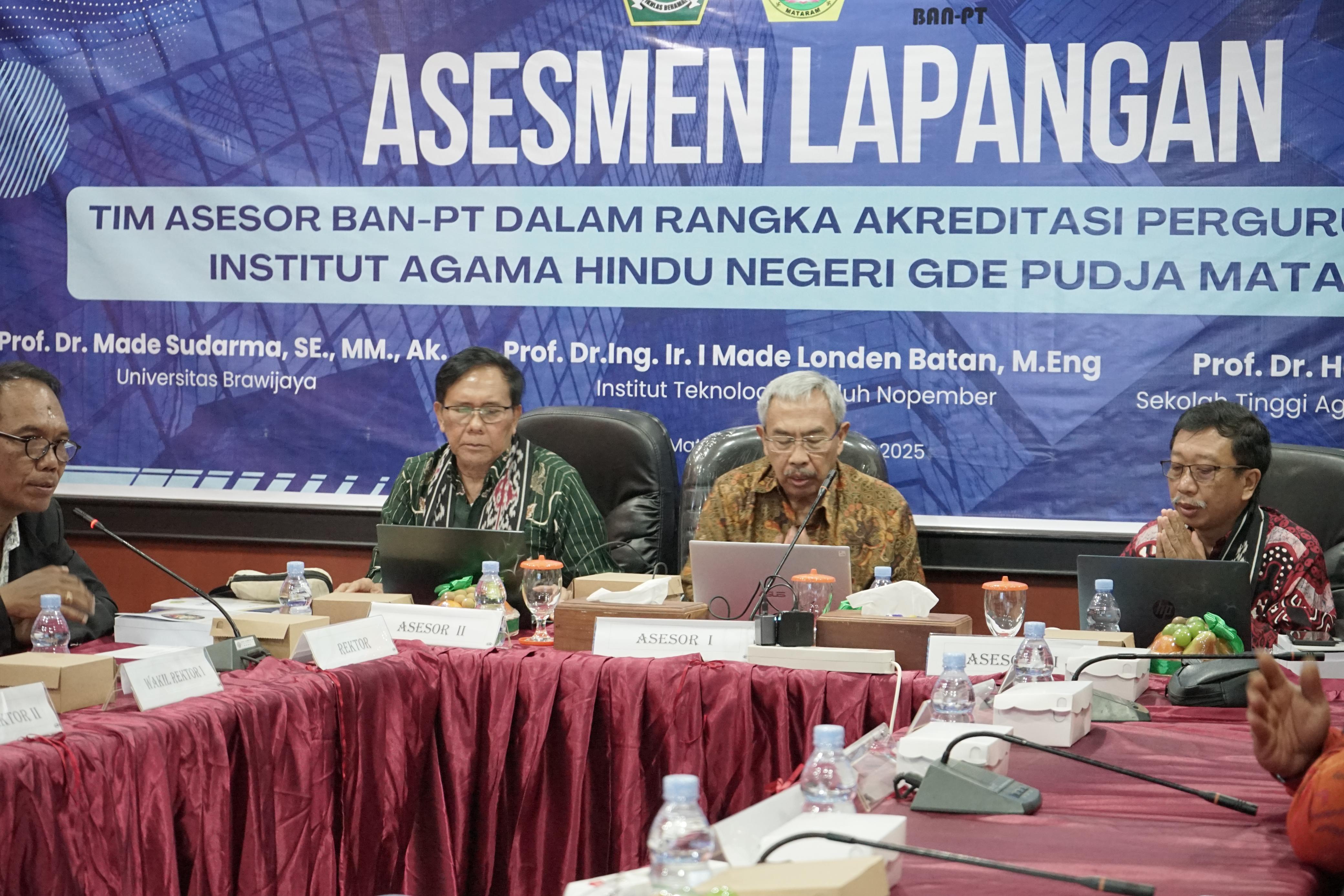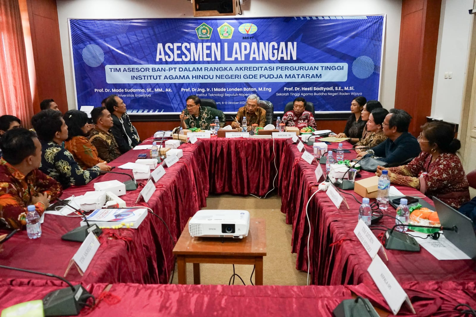 Mataram, 8 Oktober 2025 – Institut Agama Hindu Negeri (IAHN) Gde Pudja Mataram resmi menutup rangkaian Asesmen Lapangan (AL) dari Badan Akreditasi Nasional Perguruan Tinggi (BAN-PT) pada Rabu (8/10). Kegiatan ini menandai berakhirnya proses peninjauan dan verifikasi data akreditasi perguruan tinggi yang berlangsung sejak 6 Oktober 2025. Asesmen lapangan dipimpin oleh tiga asesor BAN-PT, yakni Prof. Dr. Made Sudarma, SE., MM., Ak., Prof. Dr. Ing. Ir. I Made Londen Batan, M.Eng., dan Prof. Dr. Hesti Sadtyadi, SE., M.Si. Kehadiran para asesor didampingi pula oleh perwakilan BAN-PT, Adi Putro Hastariyadi, S.Pd., MM, serta perwakilan Direktorat Jenderal Bimas Hindu, Roni Kriswanto.