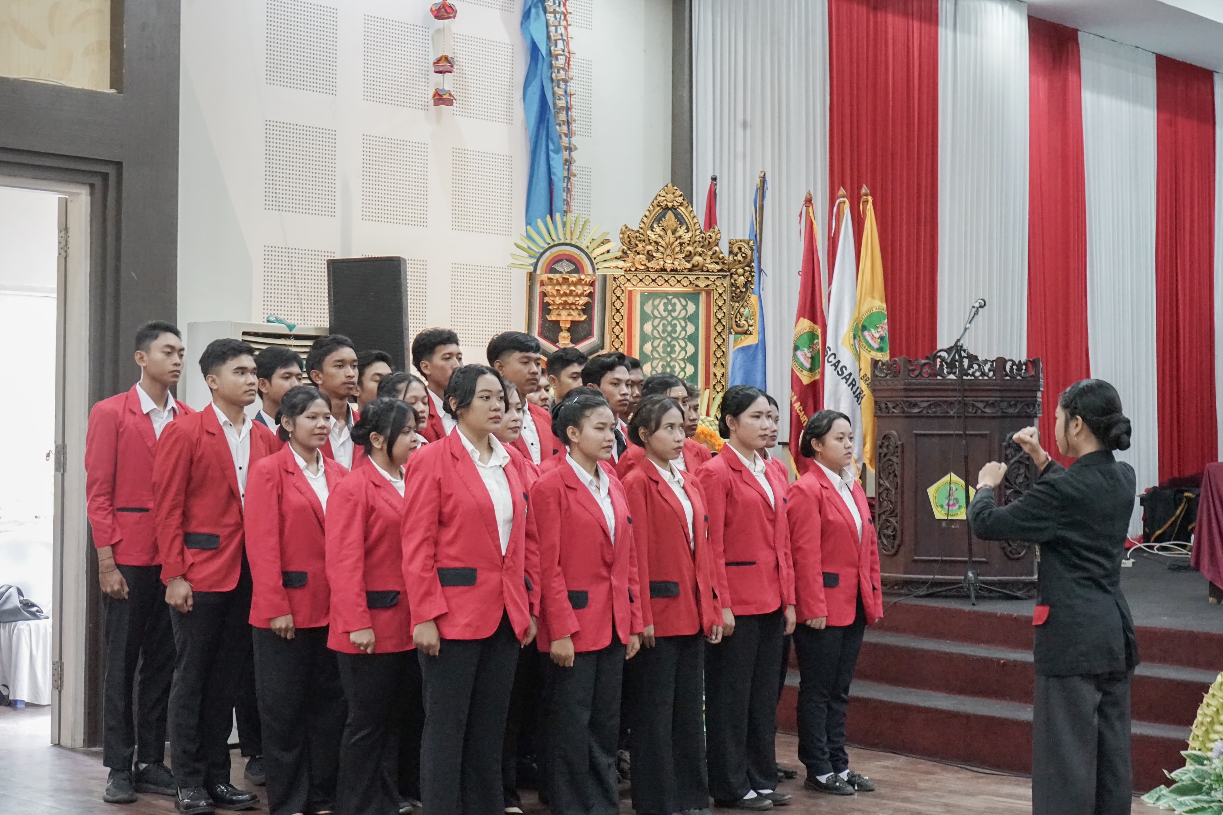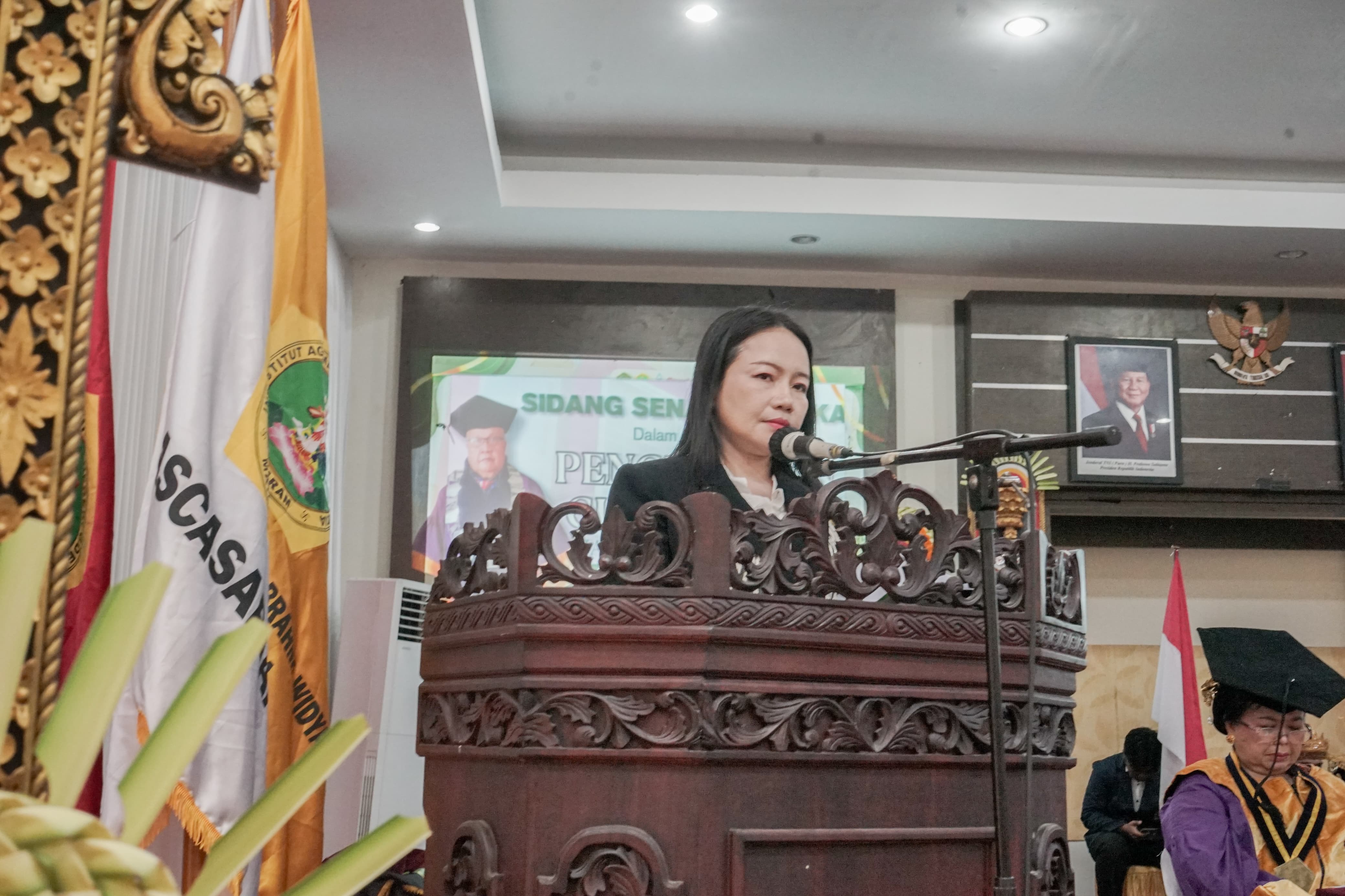 The solemn ceremony began with an opening procession and the formal declaration of the Open Senate Session by Prof. Dr. Drs. I Wayan Murba Widana, M.Ag., Chairperson of the Senate of IAHN Gde Pudja Mataram. The event was adorned by a performance of the institute’s ceremonial dance, “Vagesvari Guna Paraga,” symbolizing the harmony between wisdom, spirituality, and artistic beauty — values deeply rooted in Hindu philosophy and embodied by IAHN Gde Pudja Mataram.