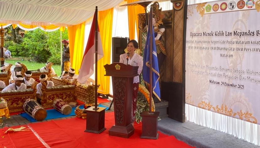 Mataram, 29 Desember 2025 — Rektor IAHN Gde Pudja Mataram, Prof. Dr. Ir. I Wayan Wirata, A.Ma., S.E., M.Si., M.Pd., memberikan apresiasi tinggi atas kesuksesan pelaksanaan Upacara Menek Kelih dan Metatah Bersama yang berlangsung di halaman kampus, Senin (29/12). Acara ini diikuti oleh 117 umat Hindu se-Pulau Lombok dan menghadirkan beragam unsur keagamaan, pemerintahan, dan akademisi.