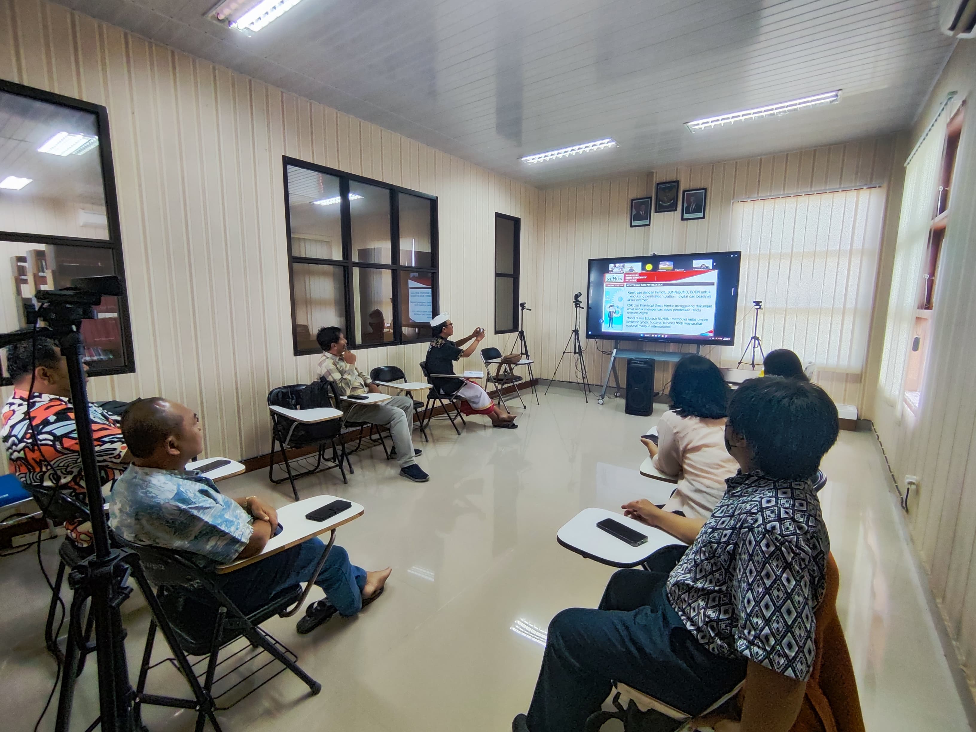 Sementara itu, Prof. Dr. Siti Zaenab, S.Ag., M.Pd., CIQaR., selaku Dekan Fakultas Dharma Acarya, menyampaikan apresiasinya terhadap semangat seluruh mahasiswa dan dosen dalam pelaksanaan PPG Batch 3. “Pelaksanaan PPG Batch 3 ini berjalan sangat optimal, terlebih dengan dukungan fasilitas Smart Classroom PPG. Kami yakin dengan berbagai persiapan yang telah dilakukan, akan mengantarkan mahasiswa mencapai kelulusan yang paripurna,” ungkapnya. Dalam sambutannya, Rektor IAHN Gde Pudja Mataram, Prof. Dr. Ir. I Wayan Wirata, A.Ma., S.E., M.Si., M.Pd., menekankan pentingnya pemanfaatan teknologi sebagai bagian dari kemajuan pendidikan di era digital. “Fasilitas Smart Classroom PPG diharapkan menjadi penunjang kemajuan teknologi dalam sistem pembelajaran jarak jauh, terutama untuk mendukung peserta PPG yang berasal dari berbagai daerah di Indonesia. Saya sangat meyakini, Bapak/Ibu mahasiswa PPG akan mampu lulus 100%, menjadi pendidik profesional yang bermartabat serta tulus mengabdi untuk mencerdaskan generasi bangsa,” ujarnya penuh semangat.