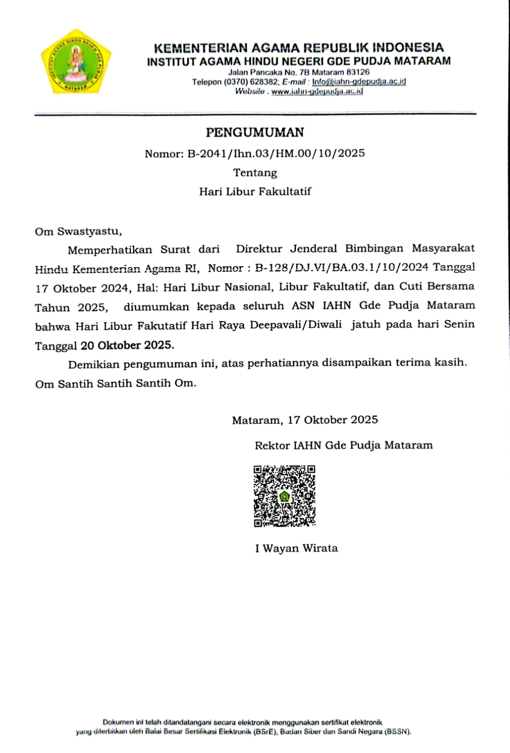 Om Swastyastu,Memperhatikan Surat dari Direktur Jenderal Bimbingan MasyarakatHindu Kementerian Agama RI, Nomor : B-128/DJ.VI/BA.03.1/10/2024 Tanggal17 Oktober 2024, Hal: Hari Libur Nasional, Libur Fakultatif, dan Cuti BersamaTahun 2025, diumumkan kepada seluruh ASN IAHN Gde Pudja Matarambahwa Hari Libur Fakutatif Hari Raya Pagerwesi jatuh pada hari Rabu Tanggal10 September 2025.