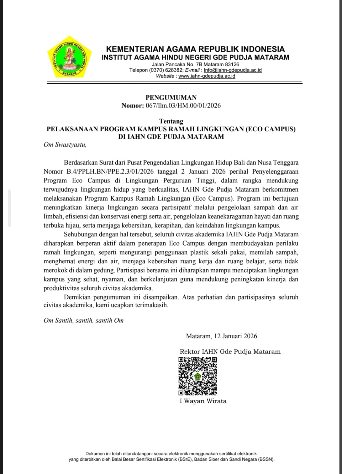 PELAKSANAAN PROGRAM KAMPUS RAMAH LINGKUNGAN (ECO CAMPUS) DI IAHN GDE PUDJA MATARAM Kamis, 15 Januari 2026 HUMAS IAHN GDE PUDJA MATARAM 70 Kontak : Info@iahn-gdepudja.ac. Website : www.iahn-gdepudja.ac.id File : Unduh file Bagikan pengumuman: