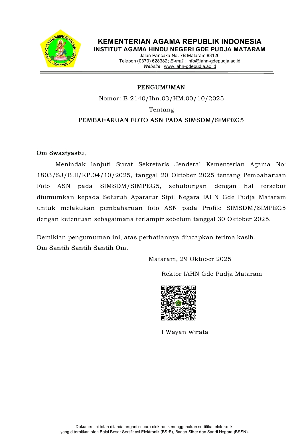 Om Swastyastu,Memperhatikan Surat dari Direktur Jenderal Bimbingan MasyarakatHindu Kementerian Agama RI, Nomor : B-128/DJ.VI/BA.03.1/10/2024 Tanggal17 Oktober 2024, Hal: Hari Libur Nasional, Libur Fakultatif, dan Cuti BersamaTahun 2025, diumumkan kepada seluruh ASN IAHN Gde Pudja Matarambahwa Hari Libur Fakutatif Hari Raya Pagerwesi jatuh pada hari Rabu Tanggal10 September 2025.