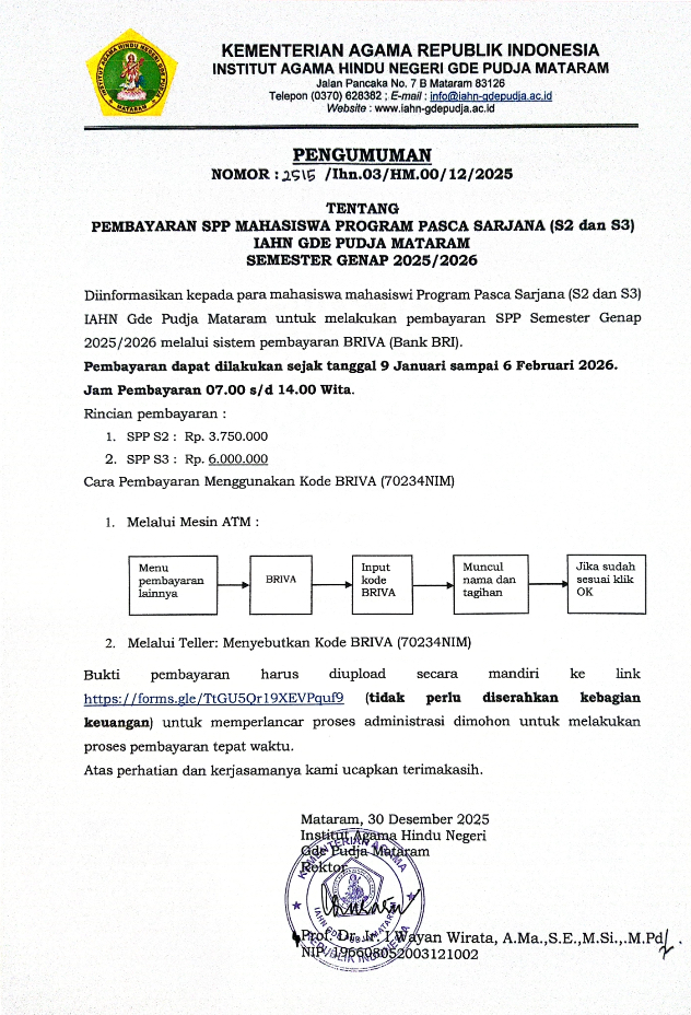 PEMBAYARAN SPP MAHASISWA PROGRAM PASCA SARJANA (S2 dan S3) IAHN GDE PUDJA MATARAM SEMESTER GENAP 2025/2026