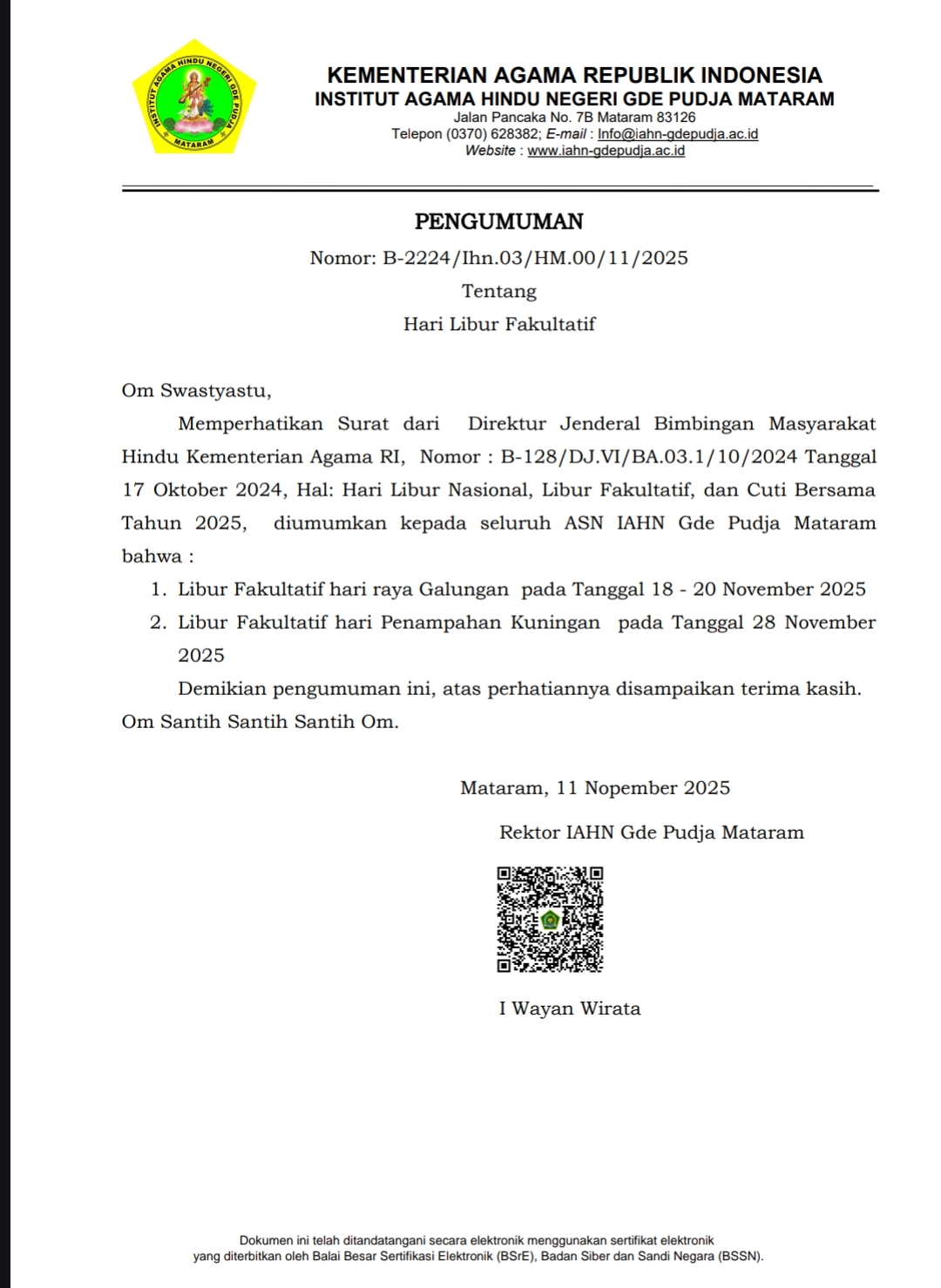 Pengumuman Nomor: B-2224/Ihn.03/HM.00/11/2025 Tentang Hari Libur Fakultatif