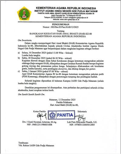 Pengumuman Rangkaian Kegiatan Hari Amal Bhakti (HAB) Ke-80 Kementerian Agama Republik Indonesia Selasa, 16 Desember 2025 HUMAS IAHN GDE PUDJA MATARAM 154 Kontak : Info@iahn-gdepudja.ac.id Website : www.iahn-gdepudja.ac.id File : Unduh file Bagikan pengumuman: