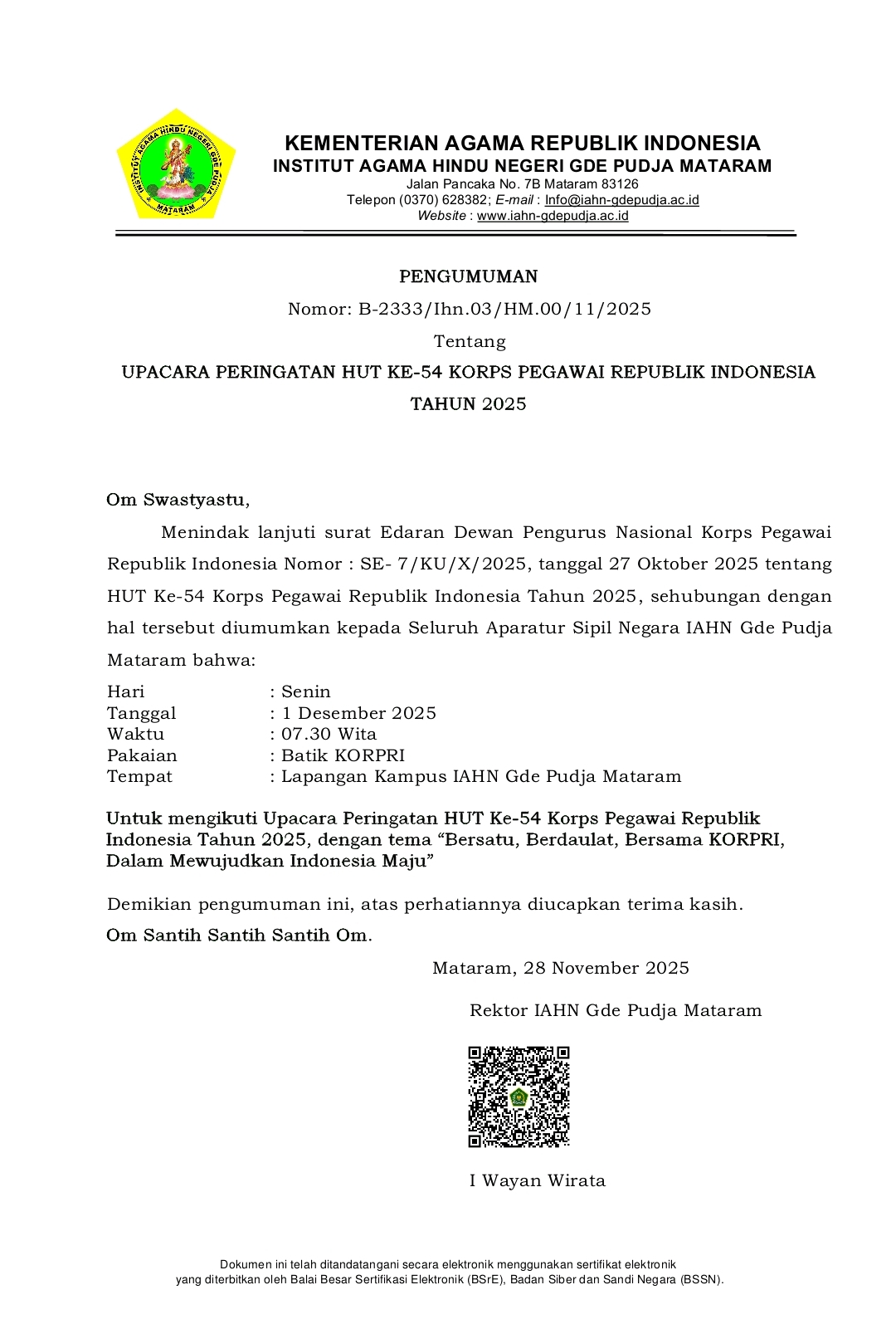 Pengumuman Upacara Hari KORPRI ke-54 Sabtu, 29 November 2025 HUMAS IAHN GDE PUDJA MATARAM 127 Kontak : Info@iahn-gdepudja.ac.id Website : www.iahn-gdepudja.ac.id File : Unduh file Bagikan pengumuman: